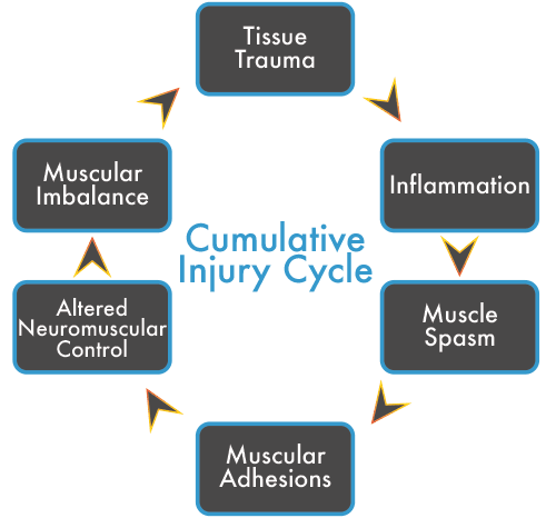 The therapy works by interrupting the pain-spasm-pain cycle, also commonly referred to as Cumulative Injury Cycle in the fitness world. This cycle is a self-perpetuating feedback loop that can cause inflammation, chronic pain and neuromuscular dysfunction. By releasing trigger points and restoring normal muscle tone, NMT can help reduce pain, increase range of motion, and improve overall motor function. (It's important to note that muscle spasm is an involuntary contraction of a voluntary muscle(s) due to stress, injury, as well as chronic tension.)